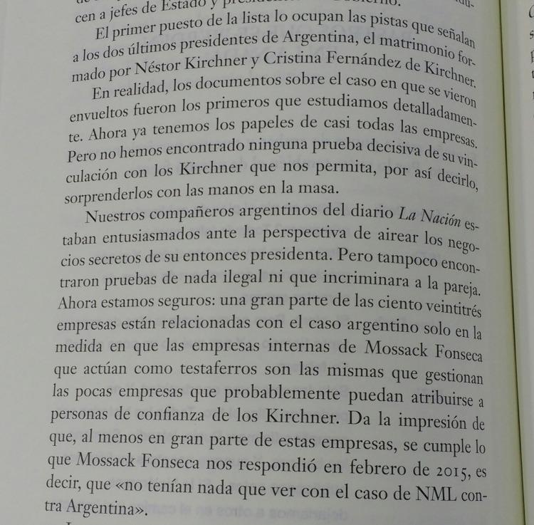 “nuestros compañeros argentinos del diario La Nación estaban entusiasmados ante la perspectiva de airear los negocios secretos de su entonces presidenta. Pero tampoco encontraron pruebas de nada ilegal ni que incriminara a la pareja”.