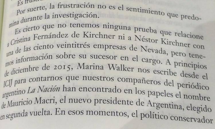 “A principios de diciembre de 2015, Marina Walker nos escribe desde ICIJ para contarnos que nuesros compañeros del periódico argentino La Nación han encontrado en los papeles el nombre de Mauricio Macri, el nuevo presidente de Argentina, elegido en segunda vuelta”, señala el libro.