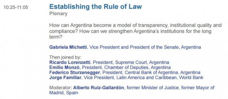 La vicepresidenta será la encargada de exponer ante inversores los ejes de transparencia y cumplimiento de las leyes, según consta en el programa del foro que organizó el gobierno. La acompañarán Ricardo Lorenzetti, Federico Sturzenneger y Emilió Monzó. La vice presidenta está siendo investigada por el dinero que recibía la fundación SUMA y que fue encontrado en su casa.