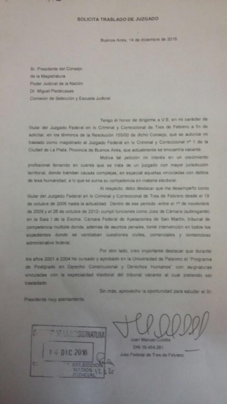 Ante esta situación el juez federal del fuero criminal y correccional de Tres de Febrero, Juan Manuel Culotta, presentó “espontáneamente” el 14 de diciembre una nota al Consejo en la que pedía el traslado de competencia a La Plata.