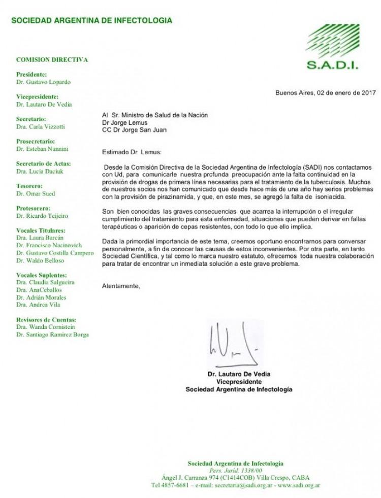 “Son bien conocidas las graves consecuencias que acarrea la interrupción o el irregular cumplimiento del tratamiento para esta enfermedad, situaciones que pueden derivar en fallas terapéuticas o aparición de cepas resistentes, con todo lo que ello implica”, advirtieron los especialistas en su carta al Ministro, a quien le pidieron una entrevista.