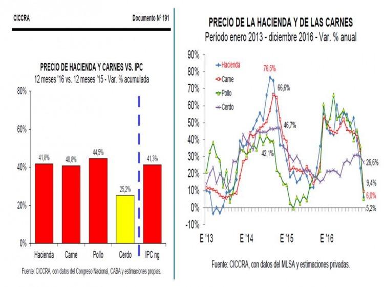 Dicho informe dice: en términos interanuales, y por cuestión de diferencias en las velocidades de ajuste de las diferentes carnes, la porcina fue la que mostro el mayor aumento en relación a diciembre de 2015 (26.6%). Por su parte, las carnes vacunas y aviar mostraron alzas de 9.4% y 5.2% anual, respectivamente. En 2016 el valor promedio de los cortes vacunos subió señalando en informes anteriores (40.8% vs 41.3%). En cambio, el precio promedio del pollo aumento a una mayor velocidad (44.5%) y el de los cortes de cerno a menor ritmo (25.2%).