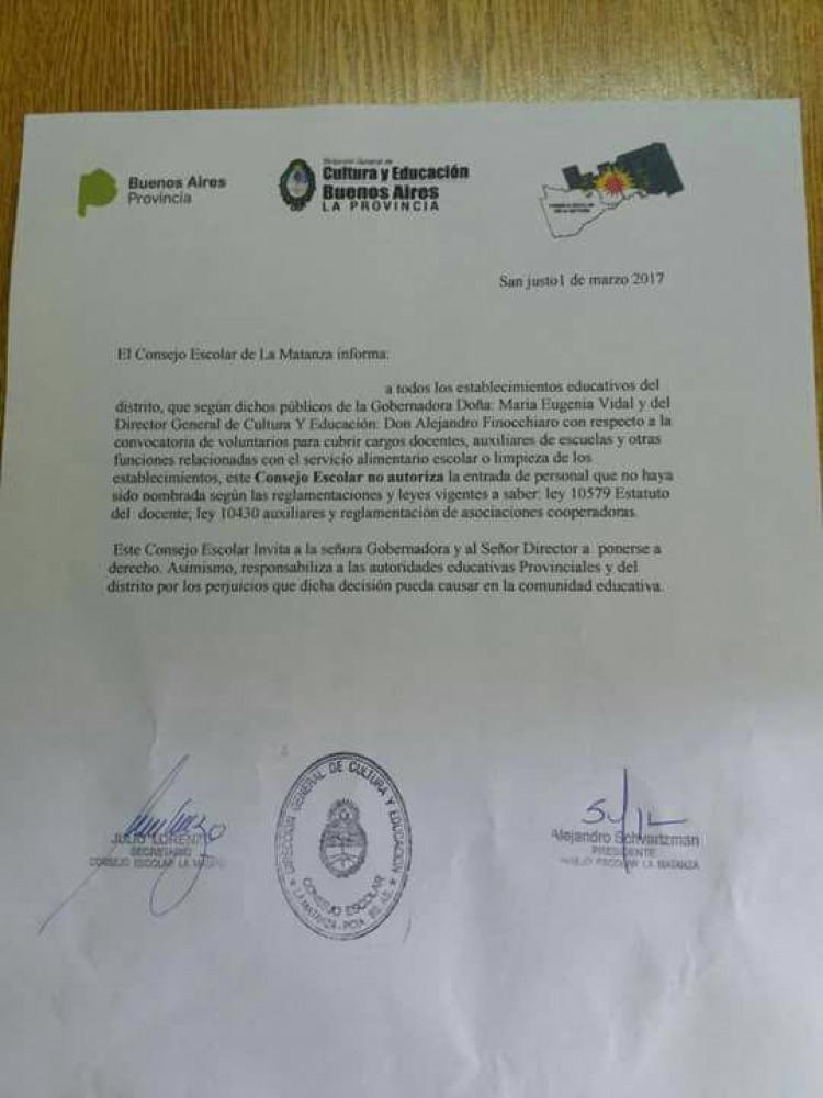 el municipio de La Matanza tomó postura y en un duro comunicado anunció que su Consejo Escolar no autoriza que ingrese a los establecimientos educativos "personal que no haya sido nombrado según las reglamentaciones y la leyes vigentes".