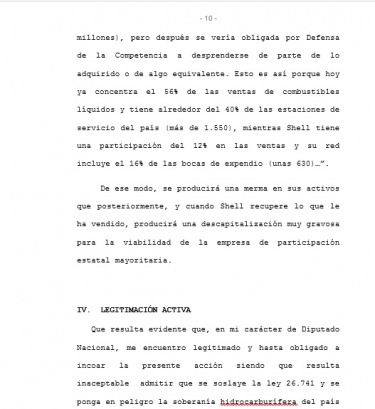 "YPF está en conocimiento de que si adquiere los activos de Shell pasaría a tener un 68% de participación en el mercado de venta de combustibles – posición dominante- ", por lo cual "a fin de ajustarse a las normas de defensa de la competencia" la empresa argentina "debería presentar, conjuntamente con la oferta de Shell, un plan de desinversión".