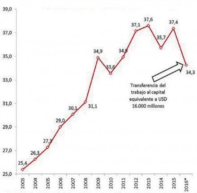 los trabajadores pierdan más de 3 puntos del Producto Bruto Interno (PBI). Esto implicó una transferencia de ingresos de 16.000 millones de dólares, que provocó una