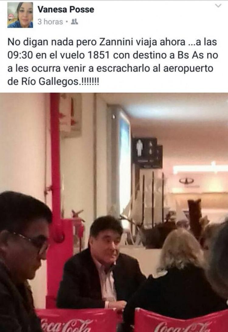 En su cuenta de Facebook, Posse mantiene una foto con Eduardo Costa y convoca a escrachar al excandidato a vicepresidente de la nación Carlos Zannini antes de que tome un vuelvo desde la provincia patagónica a Buenos Aires. Además apunta contra el secretario de Derechos Humanos provincial Horacio Pietragalla por visitar la escuela itinerante que los docentes mantiene en el Congreso en búsqueda de una reapertura en la paritaria nacional.