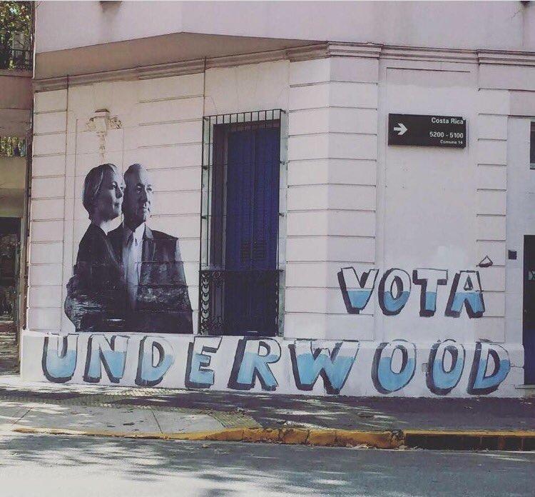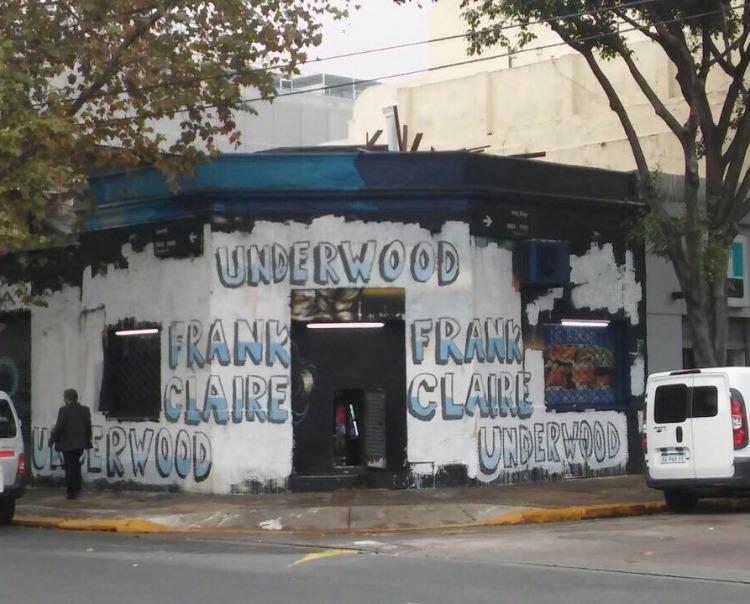 "Votá Underwood", dicen los graffitis que pueden verse en paredones de Palermo, junto a imágenes del polémico líder político de la ficción norteamericana al lado de Claire.