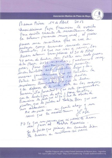 siento un profundo respeto y la necesidad de acompañarla con mi cercanía y oración. Sólo ella sabe lo que es ese sufrimiento", le escribió el sumo pontífice a Bonafini, en la misiva fechada en el Vaticano el 5 de mayo.
