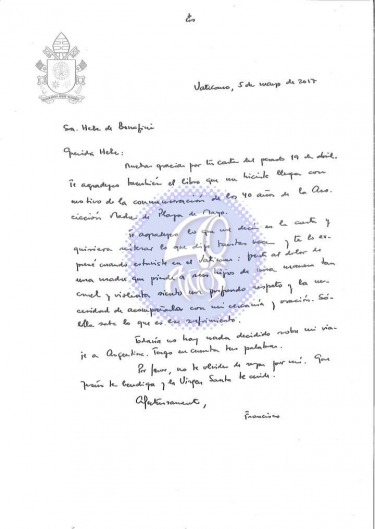 Según la entidad de Derechos Humanos, la carta del Papa fue recibida "esta misma tarde", tras ser enviada por la Nunciatura Apostólica en la Argentina.