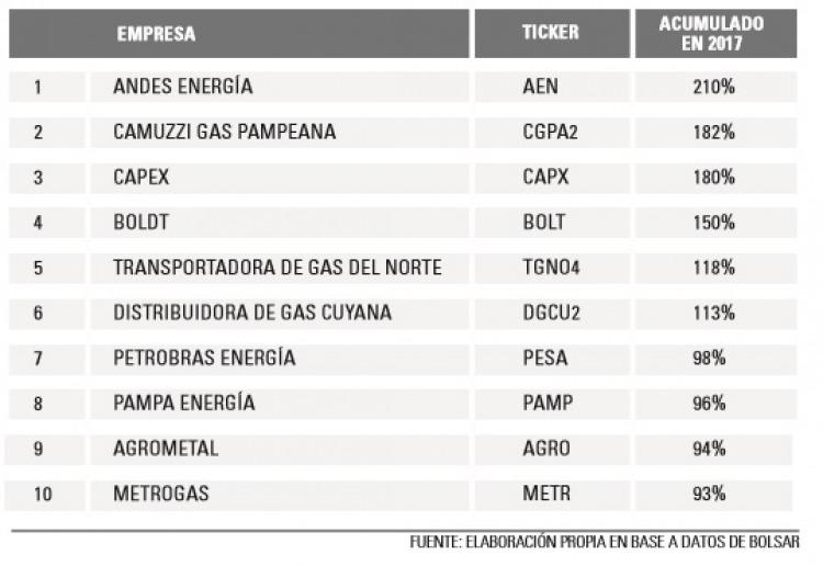 En este sentido las acciones de Andes Energía aumentaron un 210%, Camuzzi Gas Pampeana 182% y Transportadora de Gas del Norte 118%. Además dentro del sector energético pero en el rubro de eléctricas las de Capez subieron un 180% y Pampa Energía 96%.