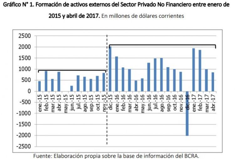 el promedio mensual de fuga, entre enero y noviembre de 2015 fue de 590 millones de dólares, mientras que entre diciembre de 2015 y abril de 2017 el promedio de salida mensual es de 1.037 millones de dólares, lo que indica un aumento del 75%, confirmó el informe.