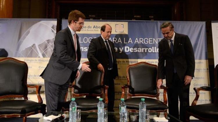 El tercer panel del encuentro "Diálogos para la Argentina", que organizó el Colegio de Abogados de la Ciudad de Buenos Aires en la Bolsa de Comercio, tuvo como protagonistas al líder radical Ernesto Sanz, al senador peronista Miguel Ángel Pichetto y al jefe de bloque PRO en diputados Nicolás Massot.