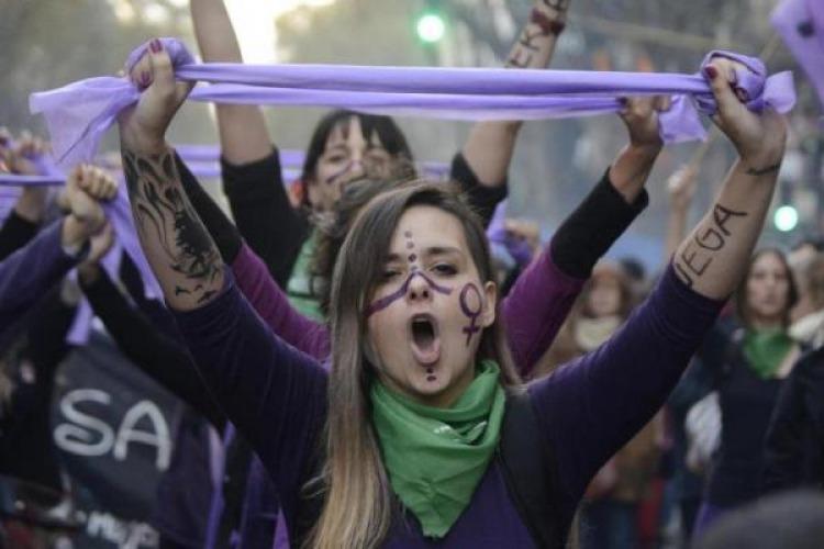 Una bandera violeta portada con la consigna