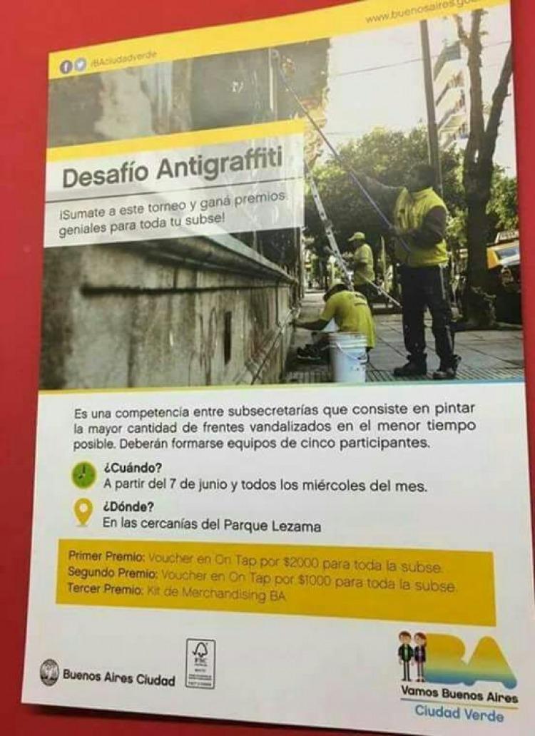 El gobierno de la Ciudad de Buenos Aires lanzó un insólito concurso para que sus empleados salgan a limpiar paredes vandalizadas con graffitis.