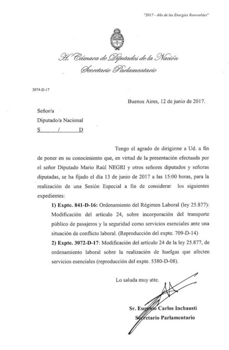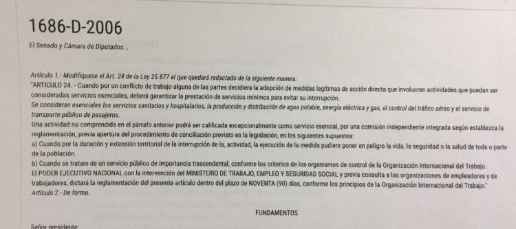 El diputado nacional de Cambiemos Mario Negri presentó un proyecto para modificar el artículo 24 del Ordenamiento del Régimen Laboral para agregar al transporte y la seguridad dentro de los "servicios esenciales". De esta manera,