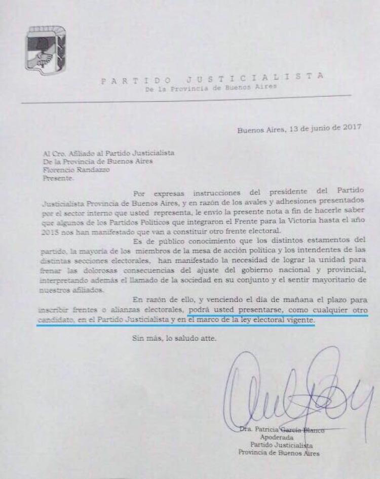 el Partido Justicialista (PJ) de la provincia de Buenos Aires le confirmó a Florencio Randazzo que podrá ser pre-candidato dentro del frente que espacio que integre el justicalismo "como cualquier afiliado". Sin embargo, sigue en duda que haya interna.