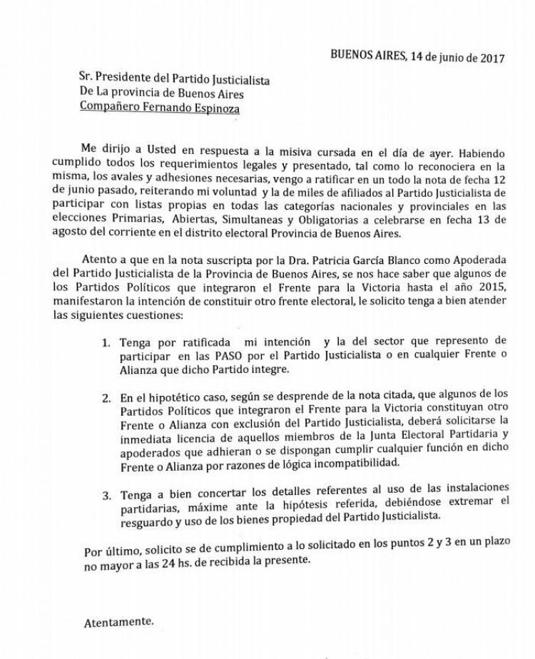 El ex funcionario ratificó su "voluntad y la de miles de afiliados al Partido Justicialista de participar con listas propias en todas las categorías nacionales y provinciales en las elecciones Primarias, Abiertas, Simultáneas y Obligatorias".