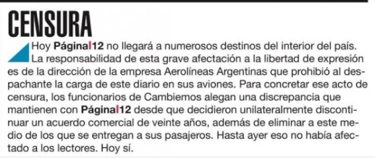 El diario Página 12 denunció hoy censura de parte de la actual gestión. En este sentido explicó que
