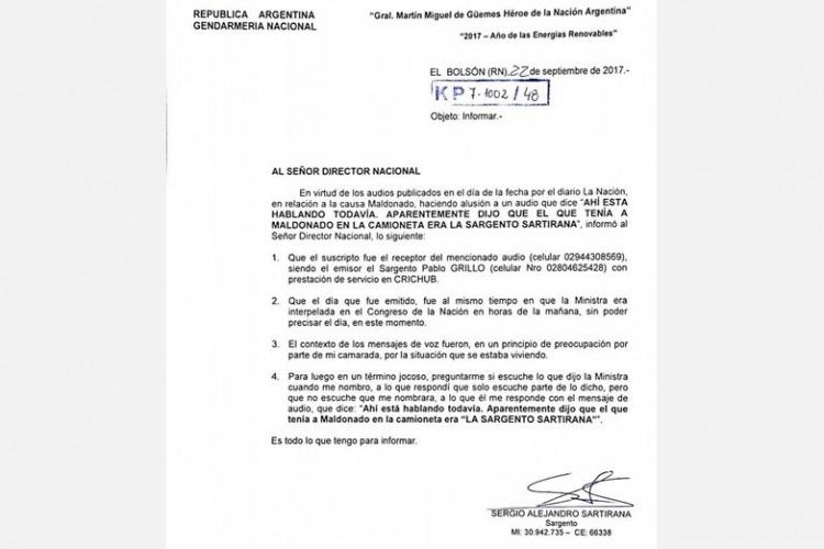 "el contexto de los mensajes de voz fue, en un principio, de preocupación por parte de mi camarada, por la situación que se estaba viviendo. Para luego, en un término jocoso, preguntarme si escuché lo que dijo la ministra [por Bullrich] cuando me nombró. A lo que respondí que sólo escuché parte de lo dicho, pero que no escuché que me nombrara, a lo que él me responde con el mensaje de audio que dice: «Ahí está hablando todavía. Aparentemente dijo que el que tenía a Maldonado en la camioneta era la sargento Sartirana»".