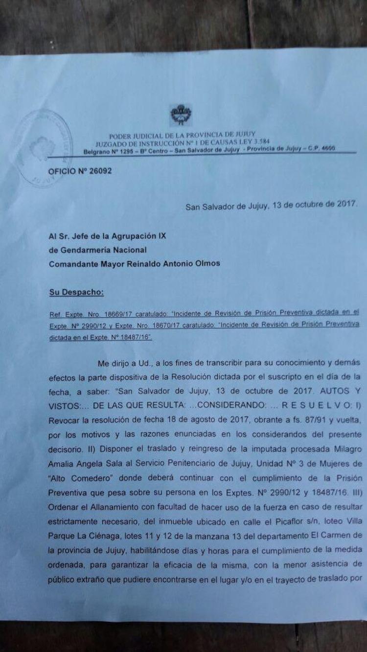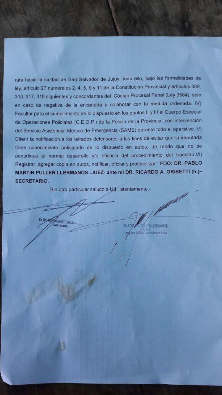 "medidas alternativas a su detención en el penal de mujeres de Alto Comedero" por considerar que corría riesgo su vida. La Cámara de Apelaciones de Jujuy revocó a fines de septiembre el beneficio de la prisión domiciliaria y ordenó su traslado a un penal.