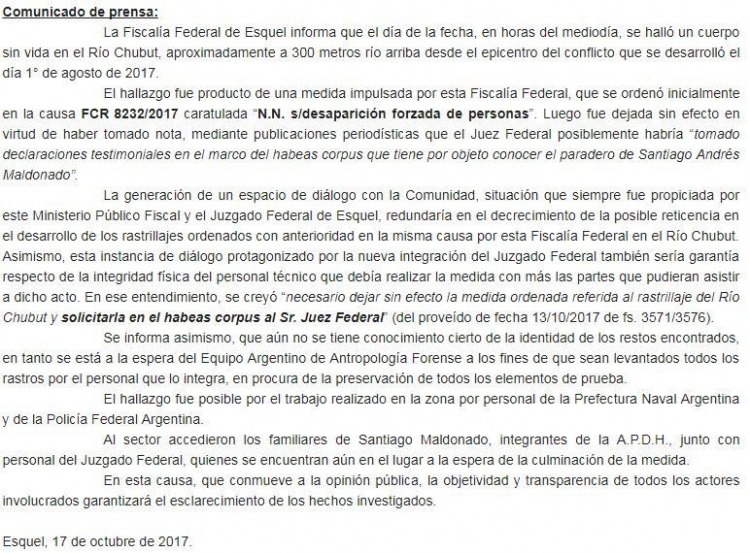 enfatizaron que al rastrillaje "accedieron los familiares de Santiago Maldonado, la APDH, junto con el personal del Juzgado Federal".