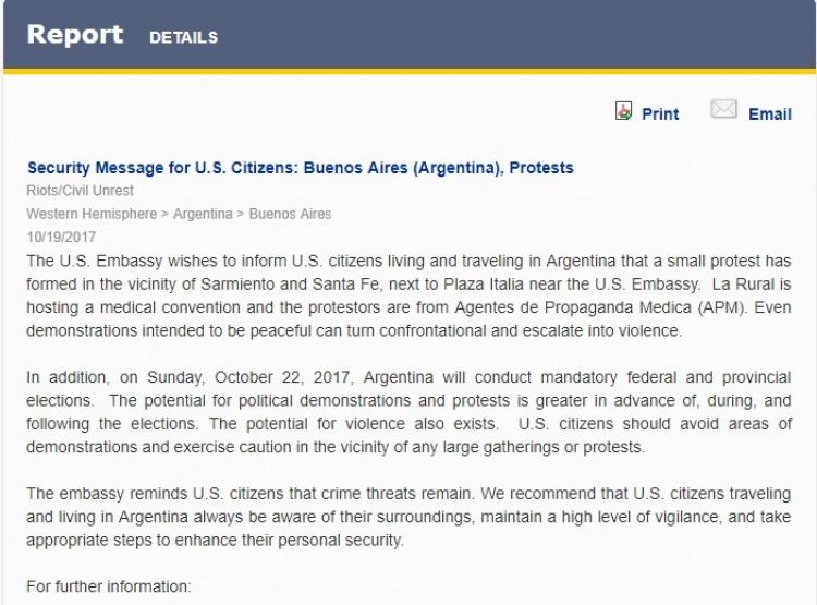 Además, el domingo 22 de octubre de 2017, Argentina llevará a cabo elecciones federales y provinciales obligatorias. El potencial de manifestaciones políticas y protestas es mayor antes, durante y después de las elecciones. El potencial de violencia también existe. Los ciudadanos de los Estados Unidos deben evitar áreas de manifestaciones y tener precaución en las cercanías de cualquier gran reunión o protesta", resaltan en el comunicado.
