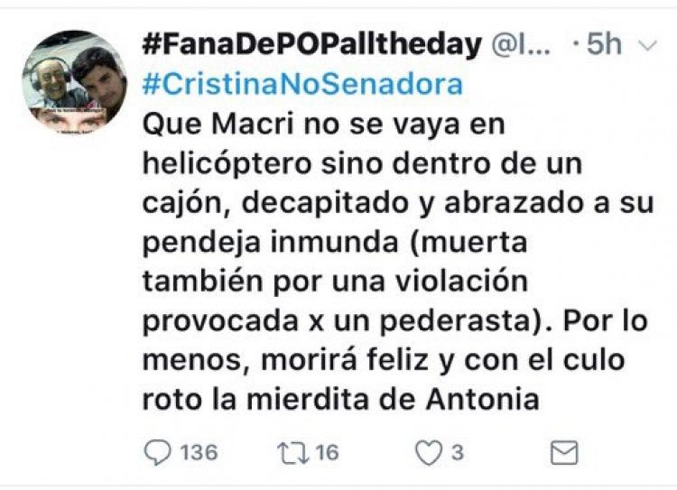 El ministerio de Seguridad informó este sábado que inició una investigación y denuncia penal por "intimidación pública" a raíz de una amenaza contra Mauricio Macri y su hija menor, Antonia, difundida mediante una cuenta de Twitter.Estas amenazas brutales inmediatamente se investigan pic.twitter.com/JuUJMc1rAj