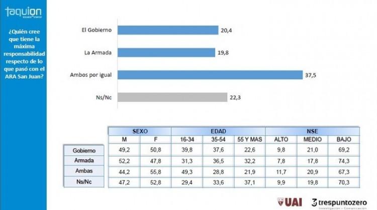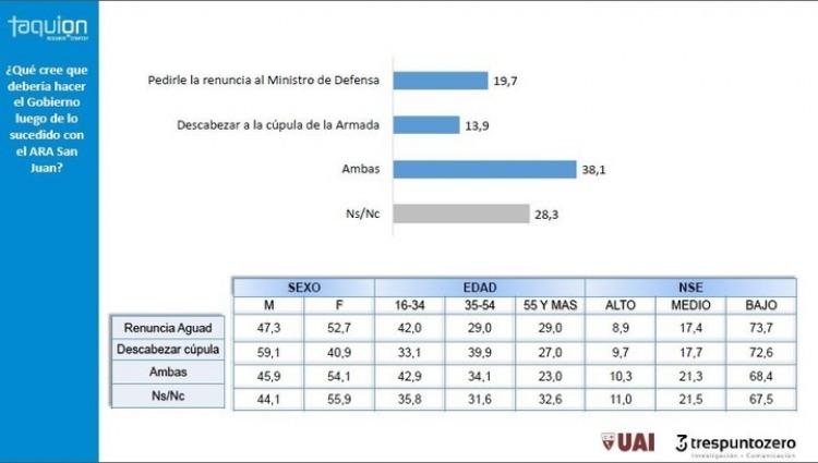Según el trabajo de la Universidad Abierta Interamericana (UAI) con la consultora Tres punto Zero que publicó Clarín, lo que la mayoría coincide en que debe ser la consecuencia de la desaparición del submarino es que Macri tiene que pedirle la renuncia a Aguad