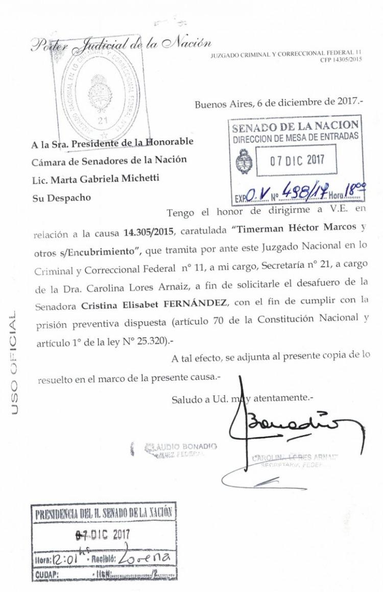 Claudio Bonadío pidió el desafuero de la senadora nacional electa, Cristina Fernández de Kirchner, y su inmediata detención acusada por