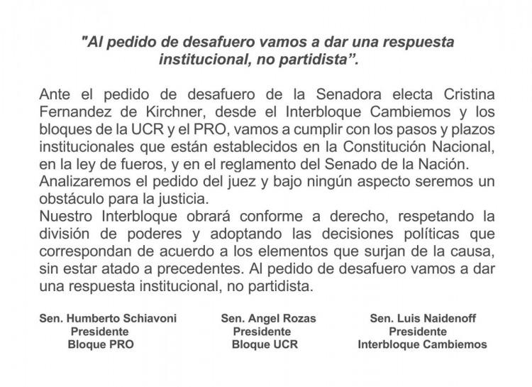 Cambiemos aseguró que "bajo ningún aspecto seremos un obstáculo para la Justicia”, por lo que se estima que darán curso al pedido de desafuero, y que actuarán “sin estar atado a precedentes", o sea sin rechazar los desafueros sin sentencia firme, como históricamente hizo el Senado.