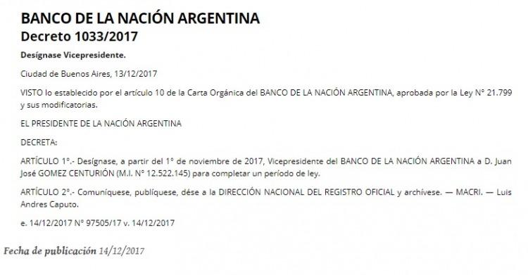 Juan José Gómez Centurión vuelve al centro de las noticias luego de su episodio al frente de la Aduana y sus problemas de salud, pero esta vez es por una nueva designación: pasará a ser vicepresidente del Banco Nación que conduce el economista Javier González Fraga según se determinó en el Boletín Oficial.