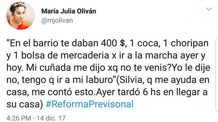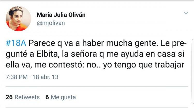 La conductora tuiteó que a su empleada le ofrecieron $400 y comida para ir a la marcha contra el ajuste a los jubilados pero que "Silvia" lo rechazó porque tiene trabajo. En 2013 tuiteó lo mismo antes de la marcha del 18A pero en ese momento la empleada que se lo dijo tenía otro nombre. Mirá los tuits acá.