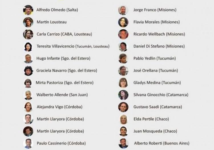 El listado completo: 4 de Córdoba (Juan Brügge, Leonardo Cassineiro, Martín Llaryora y Alejandra Vigo); 4 de Misiones (Daniel Di Stefano, Jorge Franco, Flavia Morales y Ricardo Wellbach); 3 de Evolución Radical (Martín Lousteau, Carla Carrizzo y Teresita Villavicencio); 3 de Tucumán (José Orellana, Gladys Medina y Pablo Yedlin); 3 de Santiago del Estero (Hugo Infante, Mirta Pastoriza y Graciela Navarro); 2 de Catamarca (Silvana Ginocchio y Gustavo Saadi); 2 de Chaco (Juan Mosqueda y Elda Pertile); el sanjuanino Enrique Allende; el justicialista Alberto Roberti y Alfredo Olmedo.