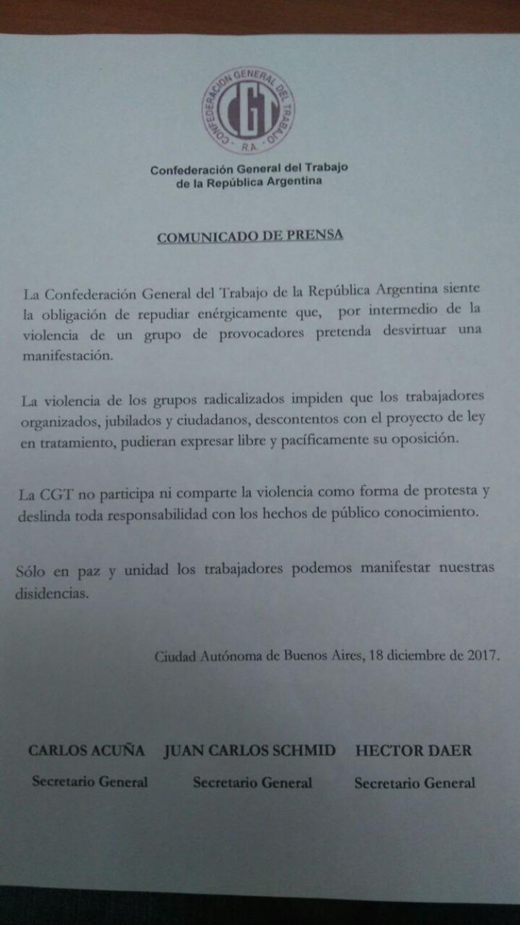 "La CGT no participa ni comparte la violencia como forma de protesta y deslinda toda responsabilidad con los hechos de público conocimiento. Solo en paz y unidad los trabajadores podemos manifestar nuestras disidencias".