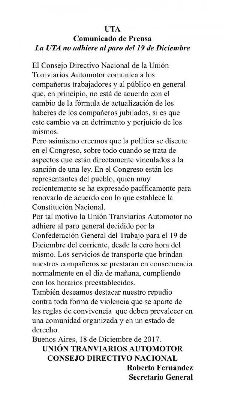 La Unión de Tranviarios Automotor (UTA) se despegó de lo decidido por la CGT y no habrá paro de transportes a partir de la noche.