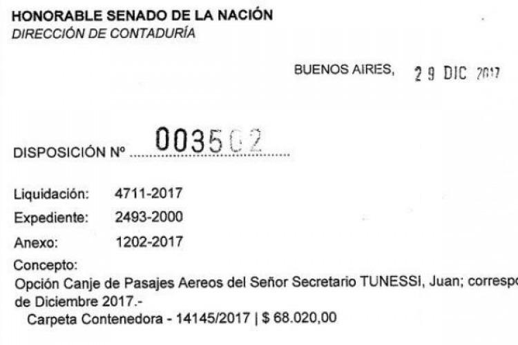 El discurso de austeridad del Gobierno no llega a sus propias filas. El secretario parlamentario del Senado, de extracción radical, aprovechó el fin de año y decidió canjear los 20 tickets aéreos que se le otorgan a los legisladores del interior para que vayan a su ciudad de origen y vuelvan a la Capital Federal.El secretario parlamentario del Senado, Juan Tunessi (UCR), canjeó el 29/12 sus 20 pasajes de diciembre y se llevó .020 para el verano.