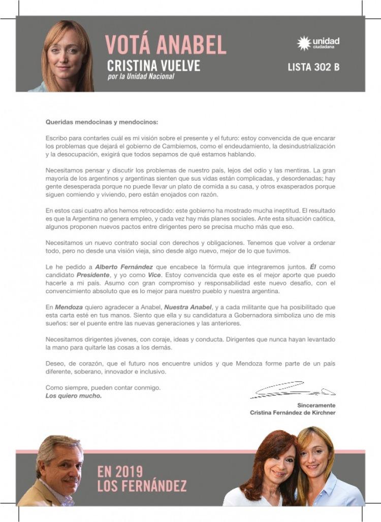 Anabel Fernández Sagasti es la elegida por Cristina Fernández de Kirchner en la interna de la provincia de Mendoza que la enfrentará el próximo domingo a Alejandro Bermejo. Un gesto clave para dirmir esta cuestión es la carta que la principal líder opositora nacional envió a los mendocinos "bendiciendo" a la actual senadora nacional de cara a los comicios.