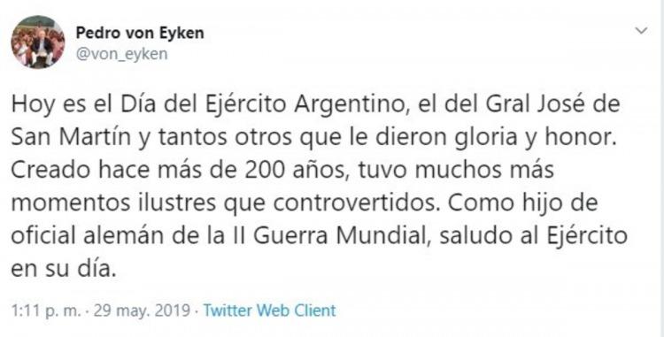 Se trata de Pedro von Eyken que por el día del Ejército destacó el rol de los oficiales alemanes conducido por Adolph Hitler durante la Segunda Guerra Mundial. El Defensor del Pueblo de la Ciudad le envió una carta al embajador Faurié para que el diplomático sea removido de su cargo.
