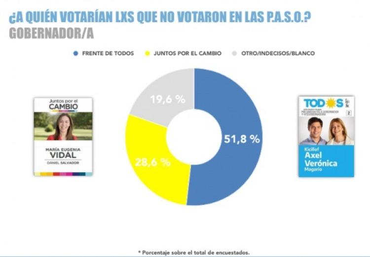 Un 19,6% de los que no fueron a votar el 11 de agosto tampoco saben si irán en octubre y mucho menos a quien votarían en ese caso. Con estos números el Frente de Todos superaría el 55% de los votos y Vidal quedaría en el 34,4% en una elección que se define por un voto.