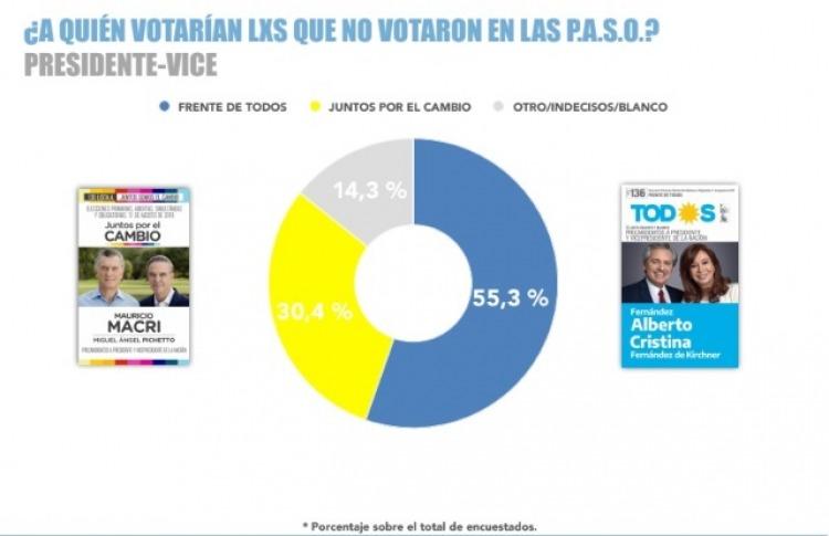 un 55,3% de los ausentes en la primaria votará por el Frente de Todos en octubre en la categoría presidencial mientras que un 30,4 lo hará por Macri. Aún hay un 14,3% que no sabe si irá a votar nuevamente y en ese caso tampoco definió a quien eligiría.