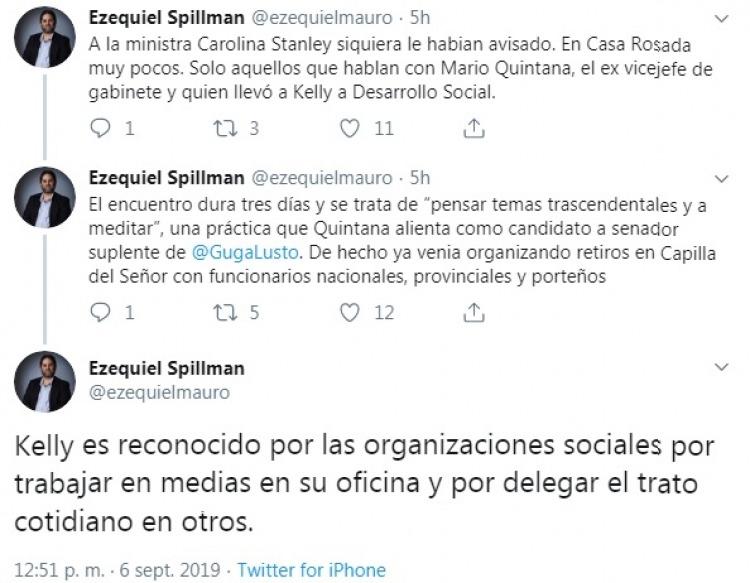 "En medio de la crisis social y los piquetes, un grupo de funcionarios del área social de gobierno nacional no tuvieron mejor idea que encarar un retiro espiritual en el norte argentino organizado por Matias Kelly, secretario de Economia Social", contó el periodista a través de redes sociales.