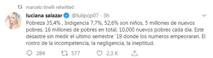 Pobreza 35,4% , indigencia 7,7%, 52,6% son niños, 5 millones de nuevos pobres. 16 millones de pobres en total, 10,000 nuevos pobres cada día", describió la modelo y cantante al conocerse los datos que el Indec difunció este lunes.