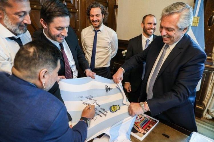 Fue recibido por Alberto Fernández, presentó un proyecto, firmó camisetas, habló sobre Macri, salió al balcón, fue ovacionado por la gente y emuló el famoso saludo de 1986. Mirá los videos y las mejores fotos.