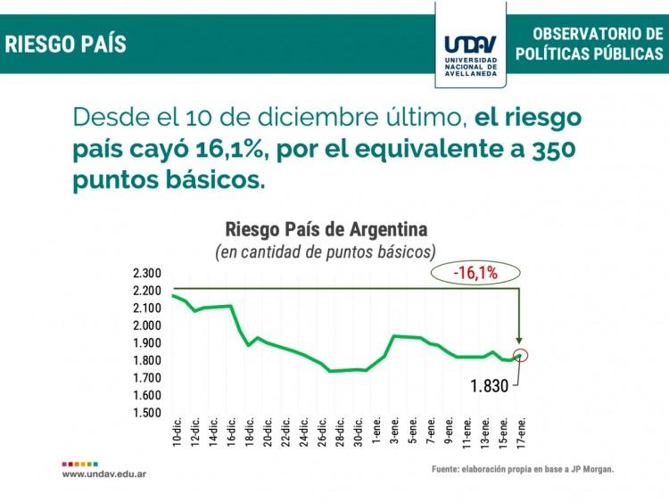 En base a los datos establecidos por la empresa de servicios financieros JP Morgan, el riesgo país disminuyó su puntuación en un 16,1 % con respecto al valor del día de la asunción del gobierno, donde el riesgo país se mantenía por encima de los 2200 puntos.
