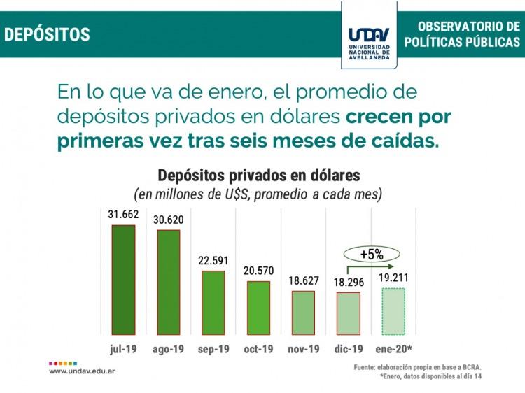 Finalmente, el estudio del Observatorio de Políticas Públicas de la UNDAV expone que, en lo que va de enero, el promedio de depósitos privados en dólares crecen por primera vez tras seis meses de considerables caídas.
