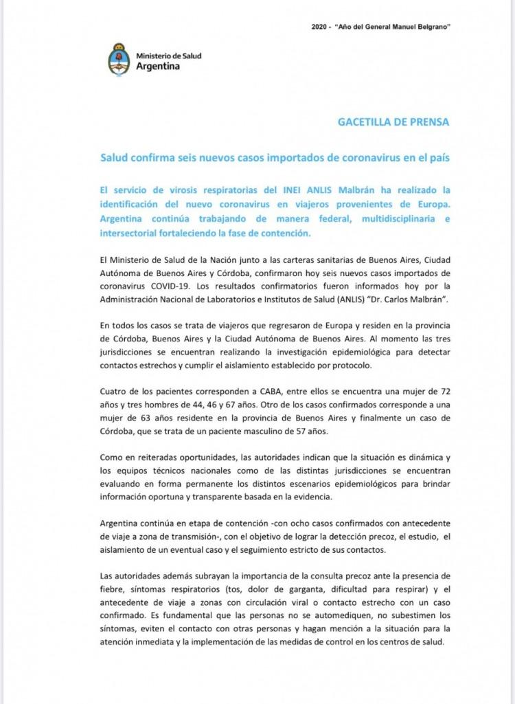los seis nuevos casos "importados" de coronavirus COVID-19, es decir que aún no hubo contagios a nivel local. Los resultados confirmatorios fueron informados hoy por la Administración Nacional de Laboratorios e Institutos de Salud (ANLIS) “Dr. Carlos Malbrán”.