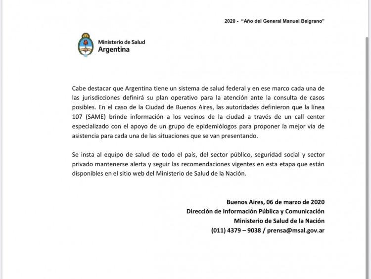 “Cabe destacar que Argentina tiene un sistema de salud federal y en ese marco cada una de las jurisdicciones definirá su plan operativo para la atención ante la consulta de casos posibles", señalaron.