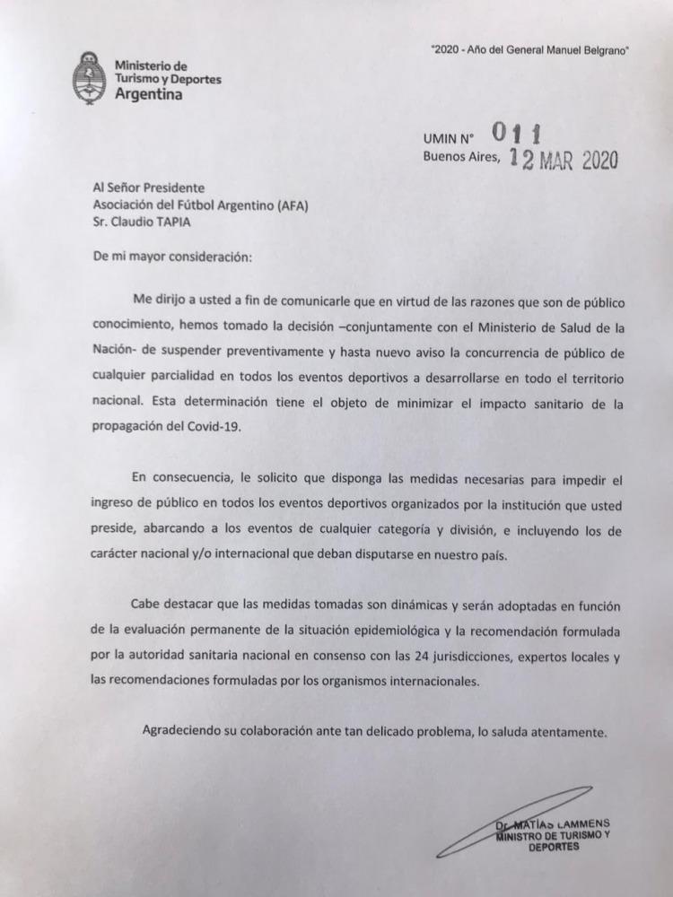 El ministro de Turismo y Deportes, Matías Lammens, le envió una carta formal a los presidentes de AFA y Superliga, Claudio Tapia y Marcelo Tinelli, ordenando de manera oficial que dispongan "las medidas necesarias para impedir el ingreso del público en todos los eventos deportivos organizados por la institución".
