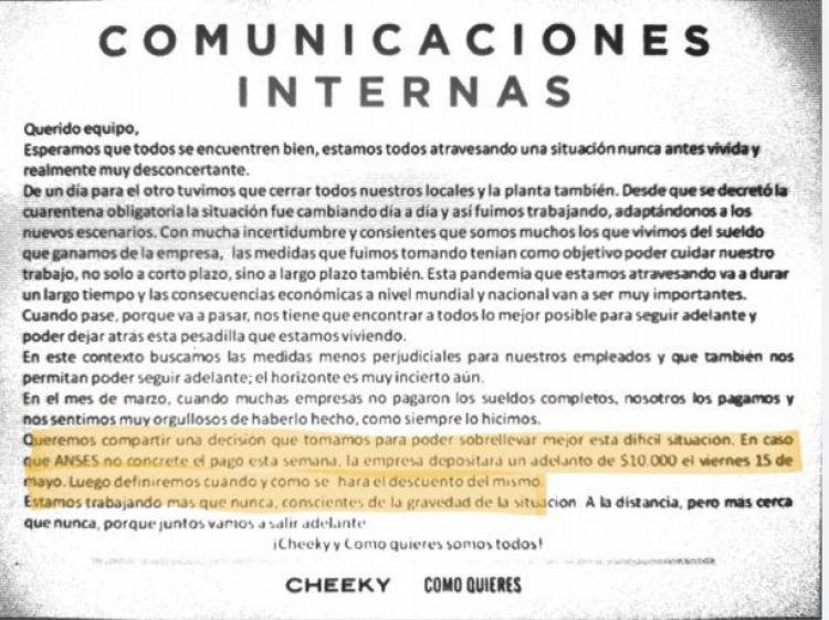 Cheeky afirmó que “para sobrellevar esta difícil situación” este viernes “depositará un adelanto de 10 mil pesos” en caso de que “Anses no concrete el pago esta semana”, en alusión a los subsidios ATP que representan la mitad de los salarios privados para empresas en crisis.