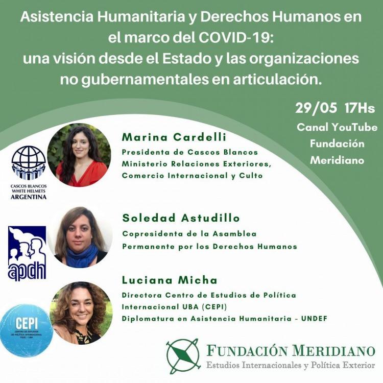 Participarán la presidenta de la Comisión Cascos Blancos, dependiente de la Cancillería Argentina, Marina Cardelli, la copresidenta de la Asamblea Permanente por los Derechos Humanos –APDH-, Soledad Astudillo, y la Directora del Centro de Estudios de Política Internacional de la UBA, Luciana Micha, quien dirige las diplomaturas en Asistencia Humanitaria de la Universidad de la Defensa Nacional. La presentación estará a cargo de Milagros Gallelli de Fundación Meridiano.